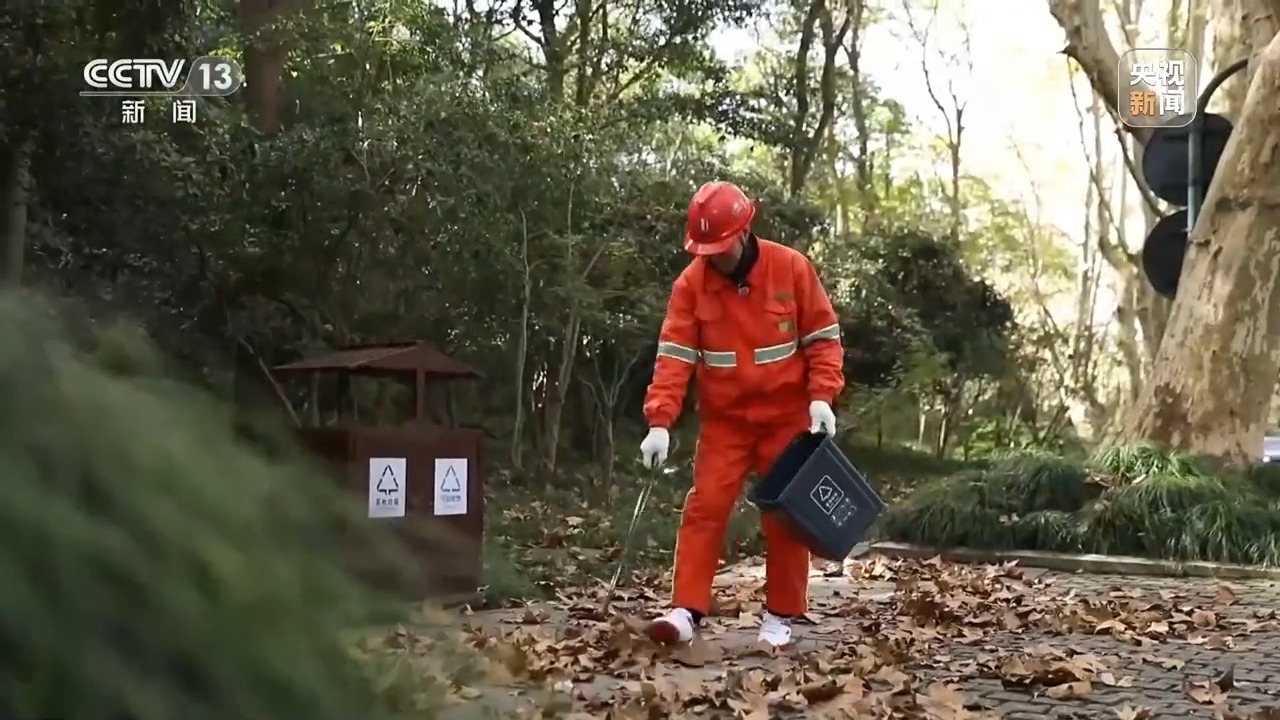 杭州美景环境服务有限公司道路保洁员 江小兰:我感觉以前习惯了扫,现在这么多落叶不扫了,不太习惯,但是每年这样留也成习惯了。都说好看,风景好,西湖有落叶真美,我也感觉是,有时候我自己也会拍一点照片。
