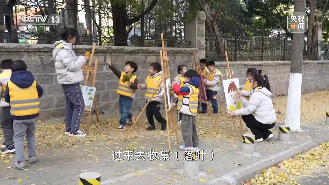 青岛市南圣顿幼儿园教师 王亚楠:我们幼儿园现在就在这个银杏大道旁边,我们经常会带着小朋友们过来去收集落叶。那么小朋友们去亲眼看到,去亲手采摘,从小树立小朋友们的这种环保意识。