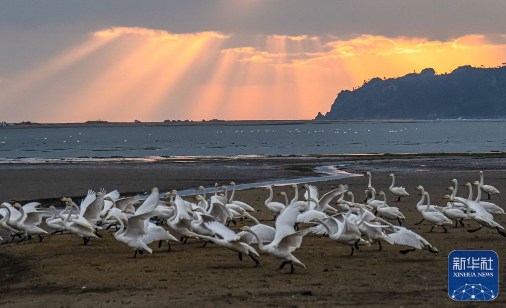 ↑ 11月18日,在山东省荣成大天鹅国家级自然保护区天鹅湖湖畔,一群大天鹅在觅食。新华社发(李信君摄)
