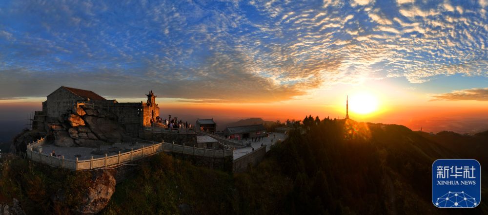 ↑ 11月18日,游客在湖南省衡阳市南岳衡山风景区欣赏日出美景(无人机全景照片)。新华社发(曹正平 摄)