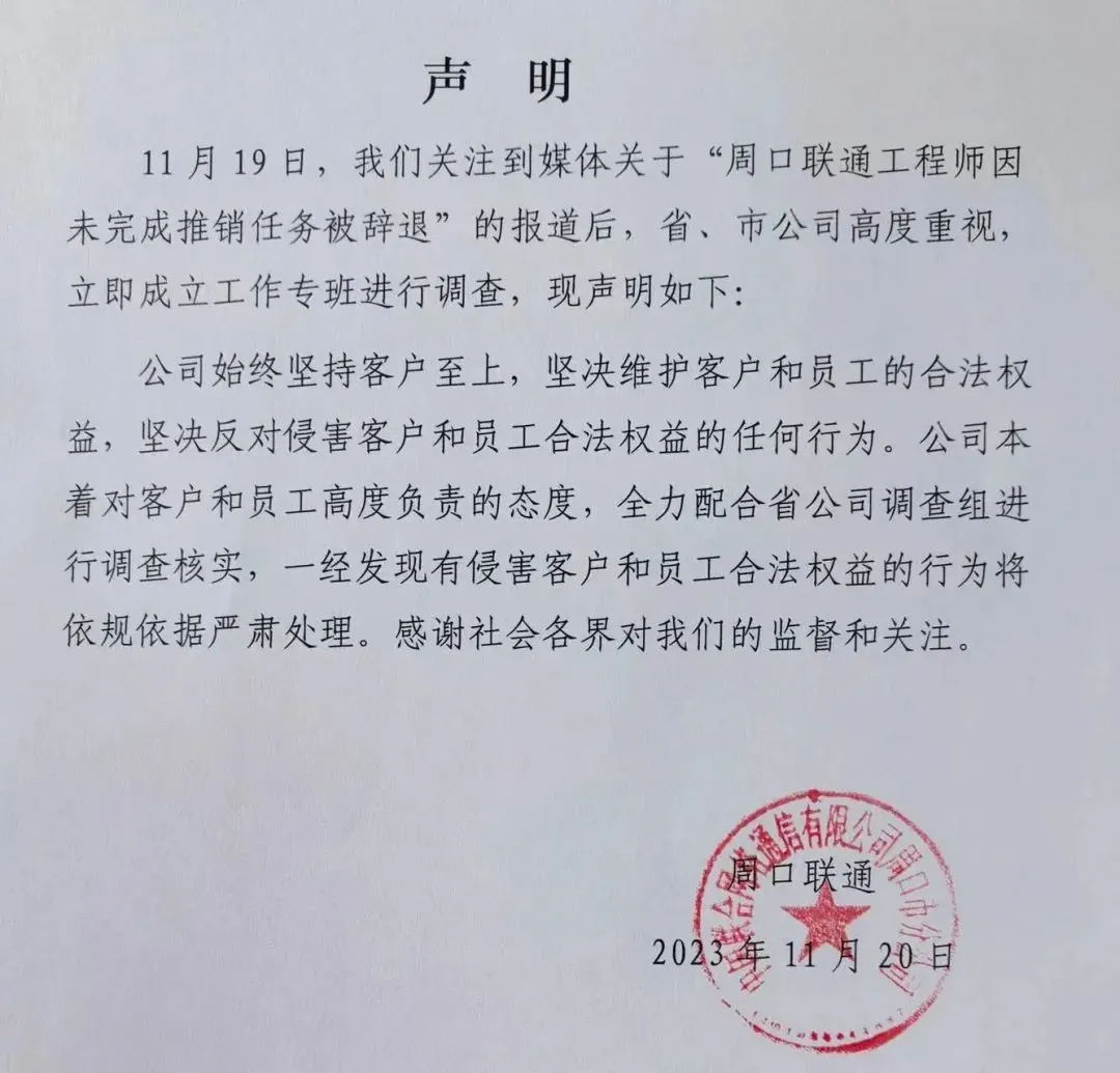 11月20日,@周口联通 发布声明称,针对“周口联通工程师因未完成推销任务被辞退”的报道,省、市公司立即成立工作专班进行调查。