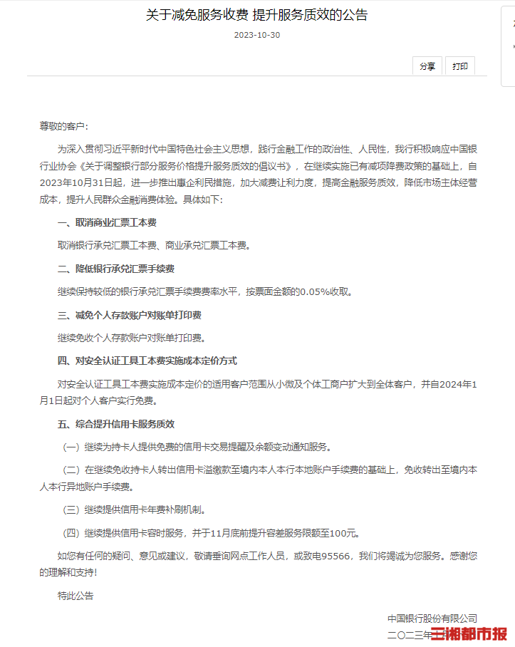 中国银行发布的公告则表示,将在2023年11月底前提升容差服务限额至100元。