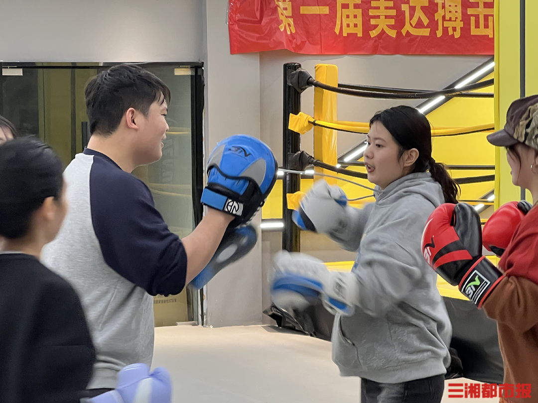 “来,准备!”“嘿哈!”场馆里喊声此起彼伏,学员们出拳抬腿铿锵有力。课程中,教练从热身、基础动作到出拳击打对抗等,均进行了细致的分步教学。学员们身上都被汗水浸湿,但都在运动时分泌的多巴胺中感到快乐。一名前来体验的学员表示:“出汗的感觉太舒服了,白天上班的压力一扫而光!”
