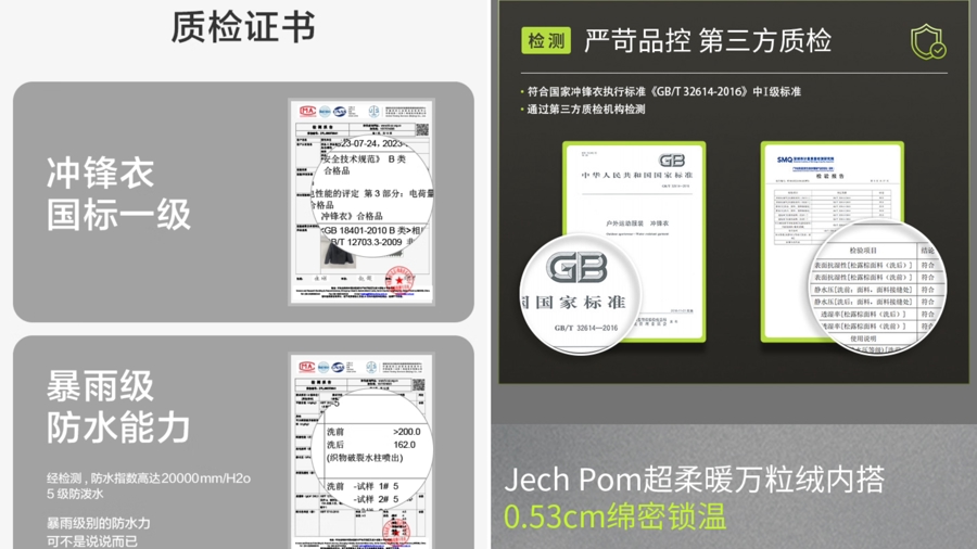 网售冲锋衣中,亮出执行标准和检测报告的品牌也不在少数