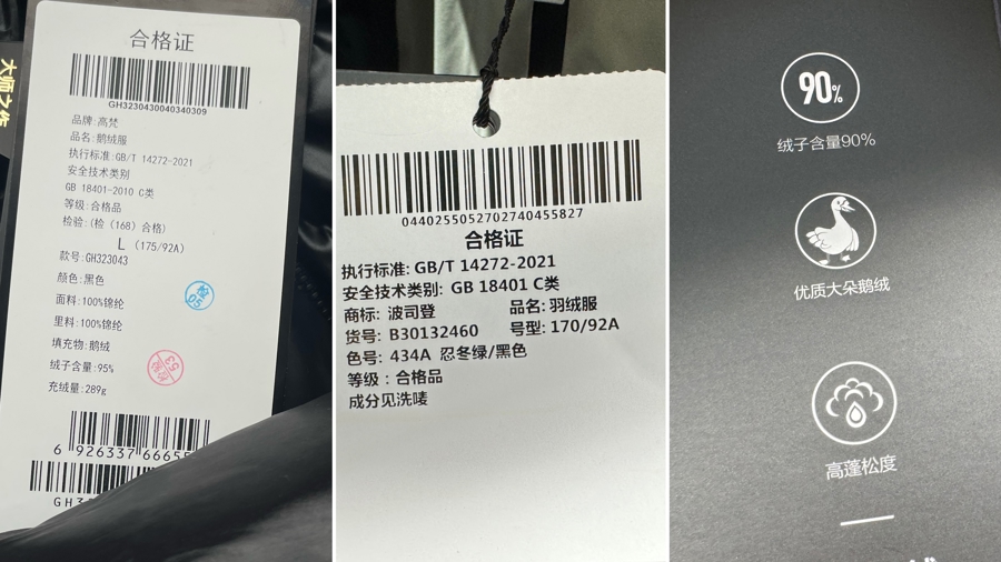 正规的羽绒服会在产品标签上列明执行标准、填充物、绒子含量等信息