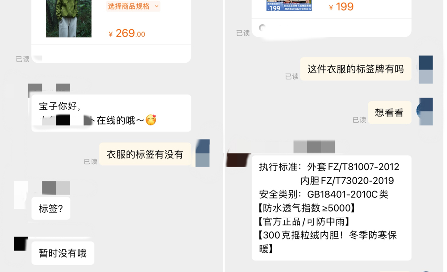 不过,冲锋衣国标属于推荐标准,有的企业因此打擦边球,部分名为“冲锋衣”没有执行该标准。在电商平台,记者选择了数款标称为“冲锋衣”的产品与客服沟通,发现有的品牌无法提供产品执行标准,还有的给出的生产标准是单夹服装(FZ/T81007-2012)、针织休闲服装(FZ/T 73020-2019)等标准。在严格意义上,这类“冲锋衣”名不副实。