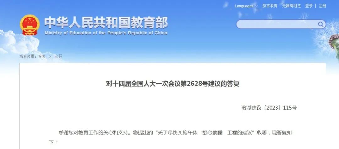 日前,教育部网站公布了对十四届全国人大一次会议第2628号建议的答复。针对“关于尽快实施午休‘舒心躺睡’工程的建议”,教育部表示,充足的睡眠时间,对保障学生身心健康发展非常重要。下一步将继续引导鼓励支持有条件的地方,统筹现有办学条件和设施设备,因地制宜创造学生午休条件,为学生身心健康发展提供有力保障。