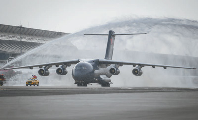 11月23日,在沈阳桃仙国际机场,运送志愿军烈士遗骸的空军专机通过水门。新华社记者 潘昱龙摄