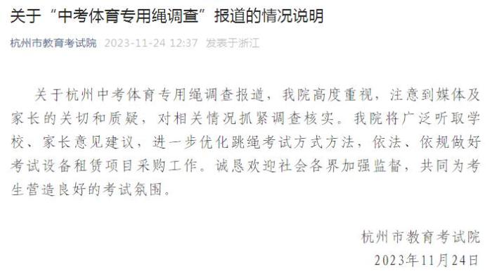 说明显示,关于杭州中考体育专用绳调查报道,我院高度重视,注意到媒体及家长的关切和质疑,对相关情况抓紧调查核实。我院将广泛听取学校、家长意见建议,进一步优化跳绳考试方式方法,依法、依规做好考试设备租赁项目采购工作。诚恳欢迎社会各界加强监督,共同为考生营造良好的考试氛围。