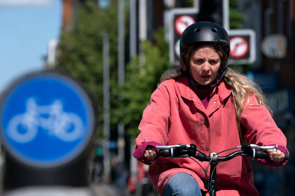 2020年5月14日,在英国曼彻斯特,一名女子骑行在自行车道上。新华社发(乔恩·休珀摄)