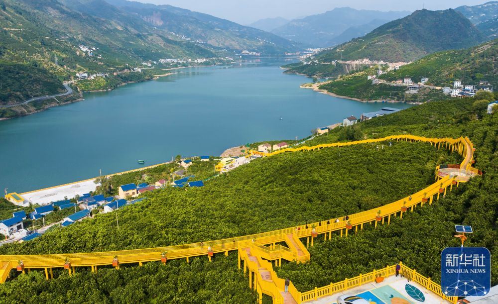 11月24日,游客在湖北省宜昌市秭归县归州镇彭家坡村脐橙园的观光廊道上游览(无人机照片)。新华社发(郑家裕 摄)