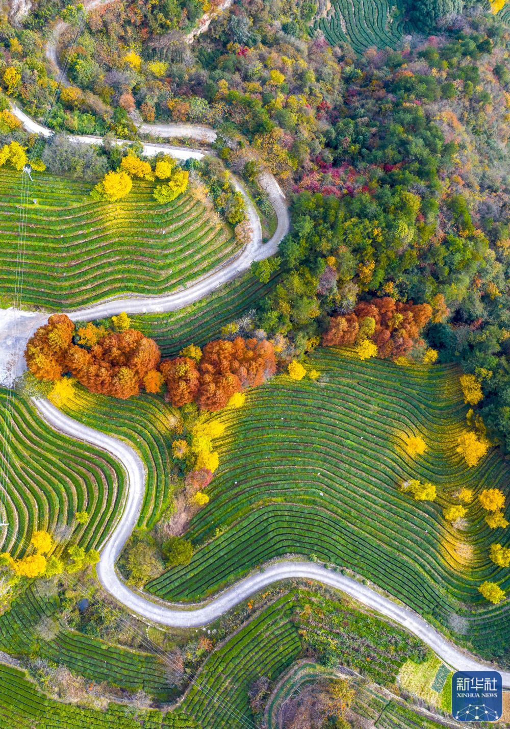 湖北省十堰市武当山旅游经济特区八仙观村的茶园色彩斑斓(11月24日摄,无人机照片)。新华社发(胡学军 摄)