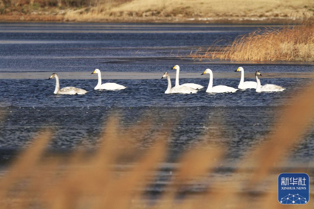 11月24日,几只迁徙来的白天鹅在甘肃省张掖市甘州区城北郊湿地公园湖水中栖息觅食。新华社发(陈礼 摄)