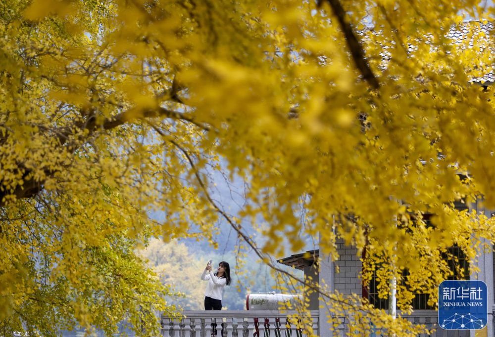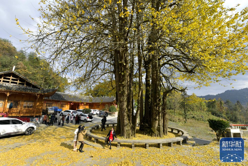 11月23日,游客在湖北省恩施土家族苗族自治州宣恩县珠山镇东门关村的古银杏树下游玩。新华社发(宋文 摄)