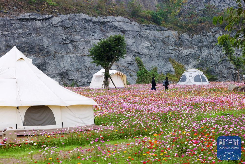 11月23日,游客在重庆市大渡口区跳磴镇新合村矿山复绿打卡地——六合矿区蒲公英成长酷玩营地的格桑花区游玩。新华社发(杨敏 摄)