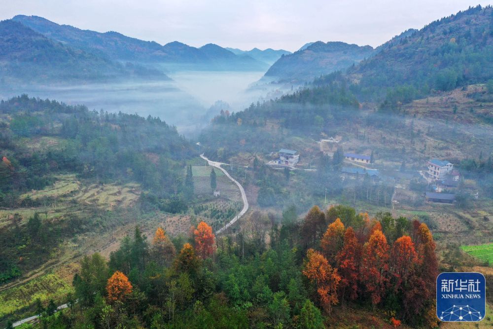 11月23日,在湖南省湘西土家族苗族自治州龙山县水田坝镇双联村晨雾缭绕(无人机照片)。新华社发(曾祥辉 摄)