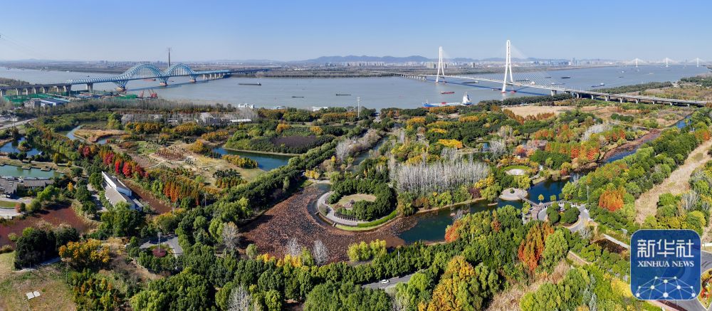 11月24日拍摄的位于江苏省南京市雨花台区的三桥湿地公园(无人机全景照片)。新华社发(方东旭 摄)