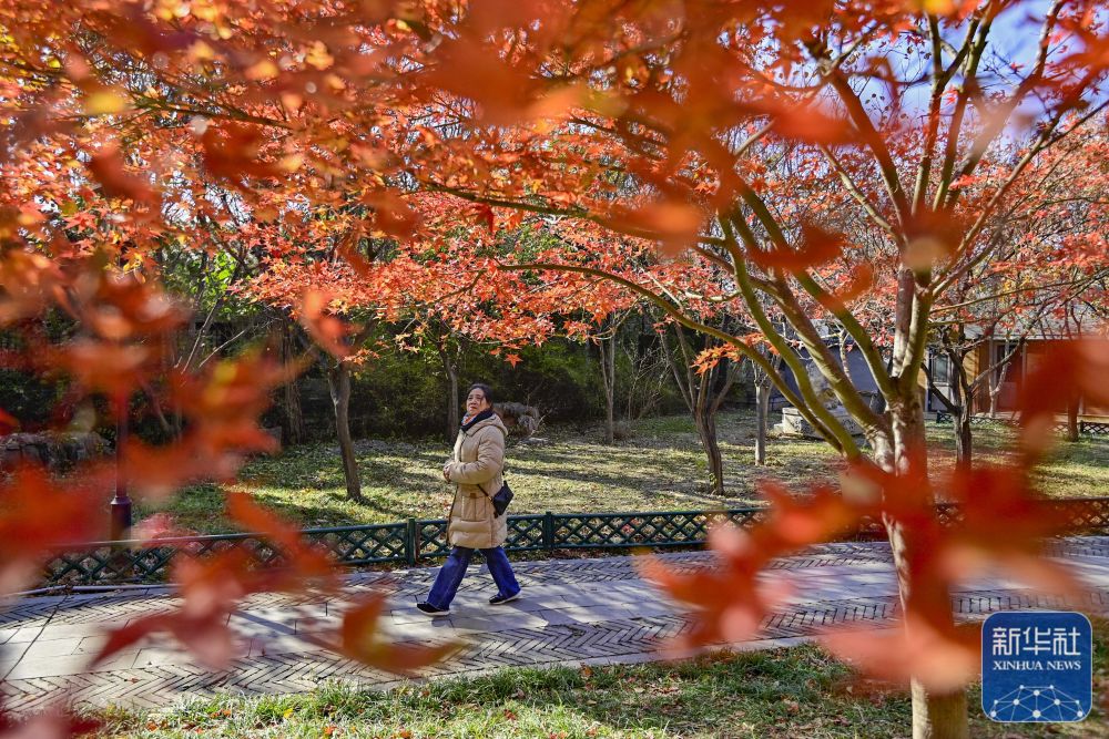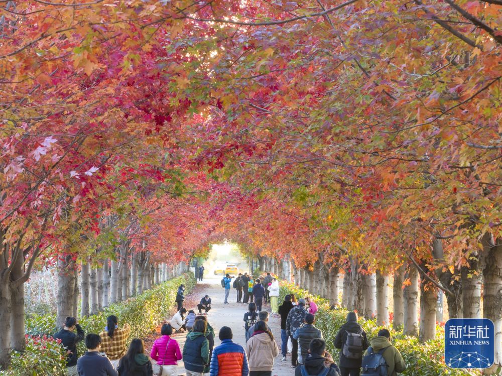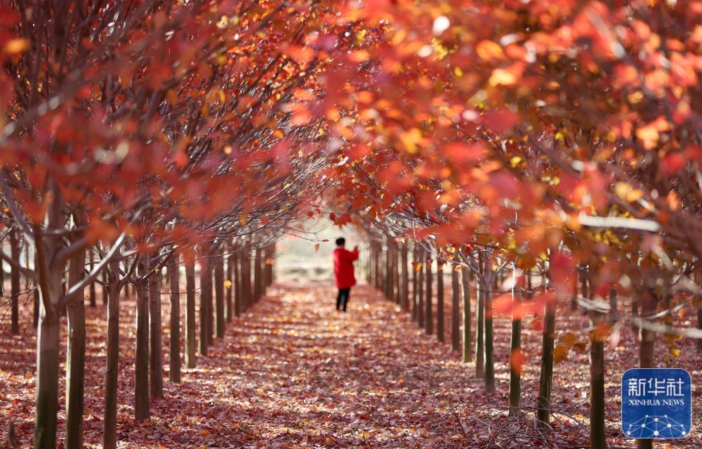 11月24日,在山东省临沂市郯城县郯城街道榆林五村一处红枫林,游人在观赏枫叶。新华社发(张春雷 摄)