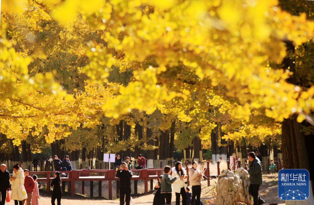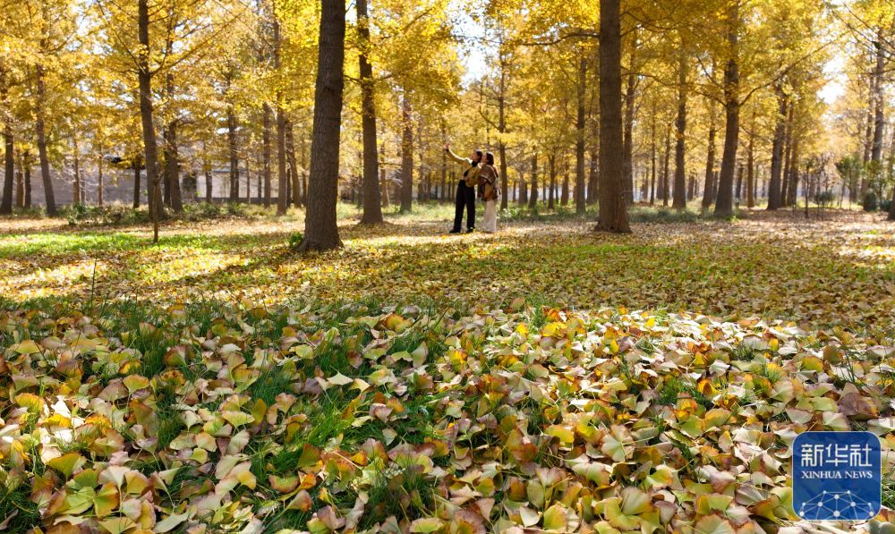 11月24日,游客在山东省临沂市生生园银杏林里游玩。新华社发(武纪全 摄)