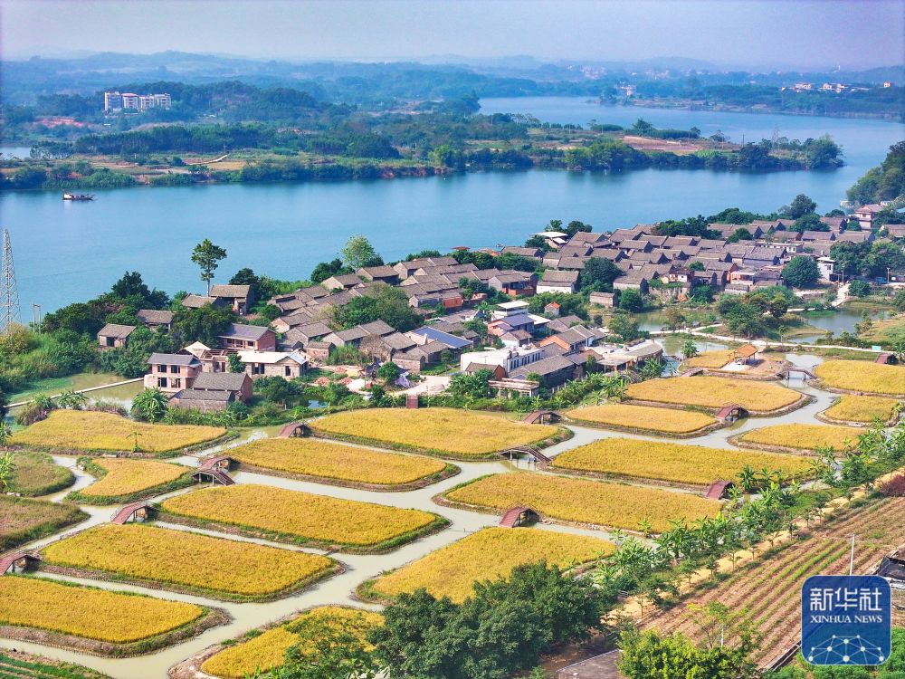 11月23日在广西南宁市江南区江西镇拍摄的稻谷金黄的景色(无人机照片)。新华社发(喻湘泉 摄)