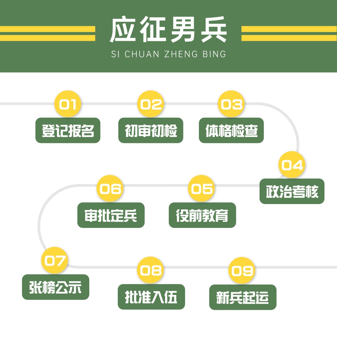 从应征报名到新兵起运,所经历的每个环节对应征青年都至关重要。小伙伴们可以提前了解应征流程与重要的时间节点。