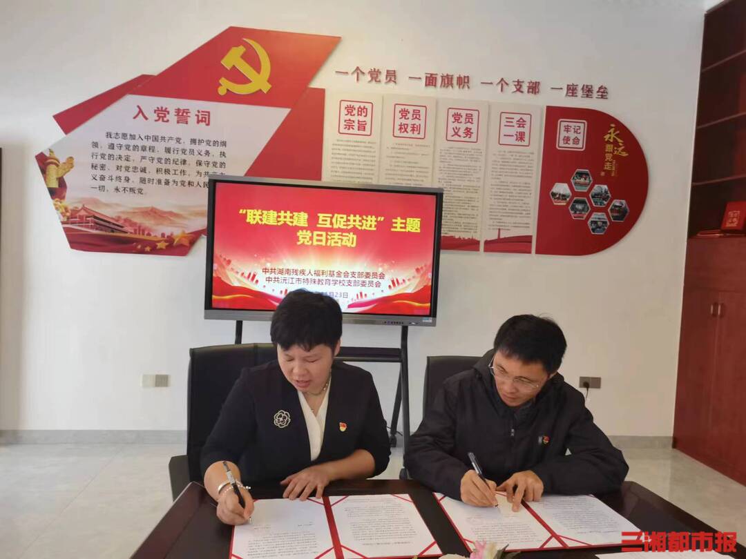 三湘都市报·新湖南客户端11月25日讯(文/视频 全媒体记者 杨昱) 重温入党誓词,上党课,走基层开展志愿服务,为残疾学生送上爱心物资……11月23日,湖南省残疾人福利基金会前往益阳沅江市特殊教育学校,共同开展“联建共建 互促共进”联合党日活动。双方签订《“支部联基层”结对共建工作协议》,深化“我为残疾学生办实事”。