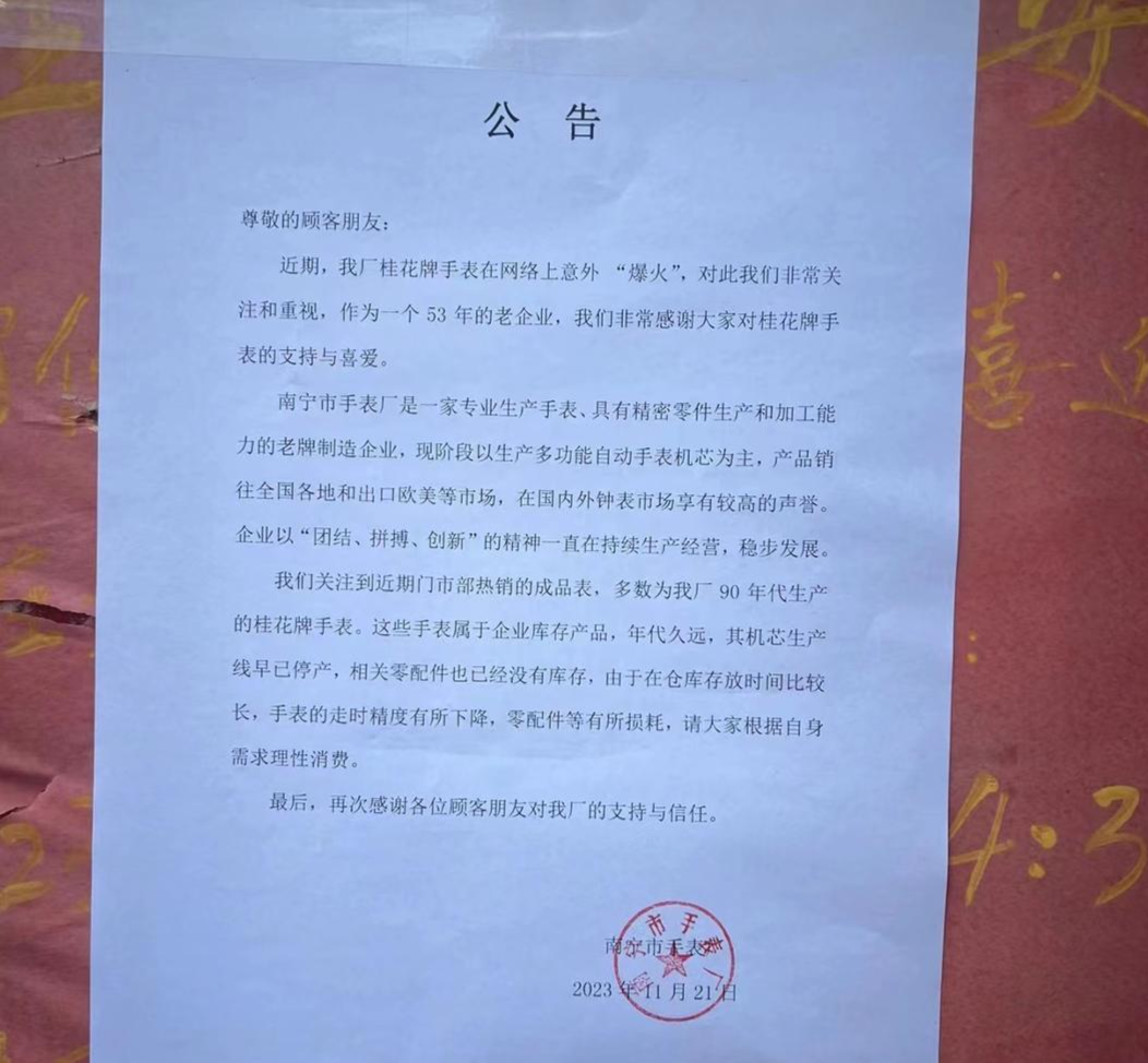 11月21日,南宁市手表厂在墙上张贴了公告,称近期门市部热销的成品表,多数为90年代生产的桂花牌手表。“这些手表属于企业库存产品,年代久远,其机芯生产线早已停产,相关零配件也已经没有库存。由于在仓库存放时间比较长,手表的走时精度有所下降,零配件等有所损耗,请大家根据自身需要理性消费。”