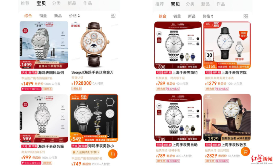 红星新闻记者梳理发现,目前“海鸥表”与“上海表”采用的是线上与线下相结合的营销手段。据海鸥牌手表和上海牌手表官网,二者均有多家线下实体店,且在淘宝、抖音、拼多多等多家电商平台均开设手表旗舰店,进行成品表零售。
