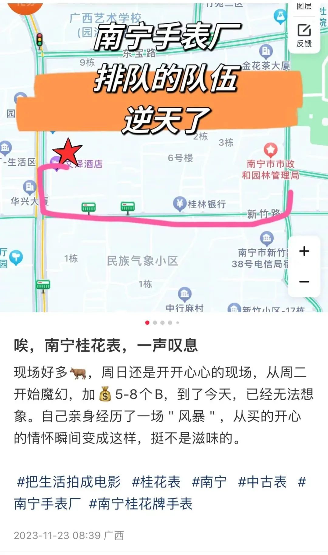 在博主“Lam”的评论区下,也有多位网友告诉博主,“托你的福,现在南宁市手表厂已成网红地,一表难求……”据悉,不少电视台也前往园湖南路18号直播排队人潮,火爆互联网。