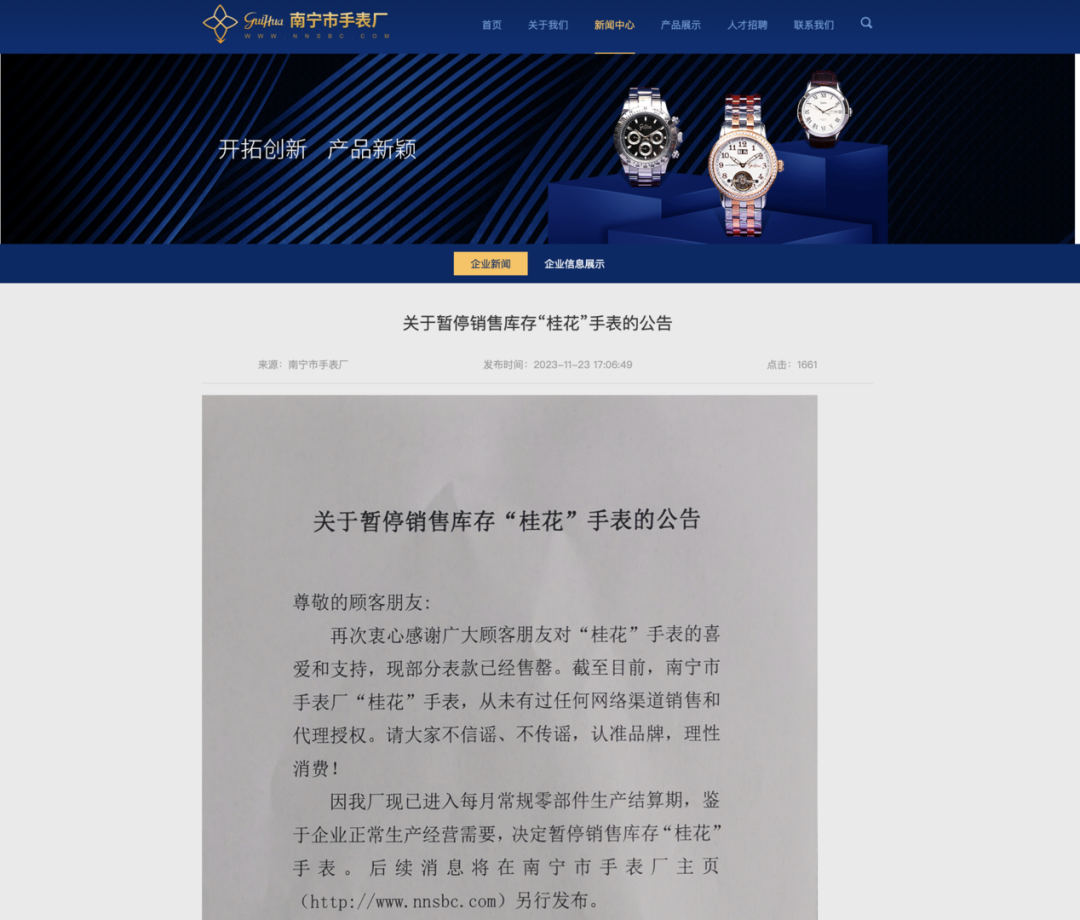 11月23日晚,南宁市手表厂官网发布《关于暂停销售库存“桂花”手表的公告》称,“因我厂现已进入每月常规零部件生产结算期,鉴于企业正常生产经营需要,决定暂停销售库存‘桂花’手表。”对于已售的库存“桂花”手表,南宁市手表厂维修部将提供自购买之日起一年的售后服务工作。