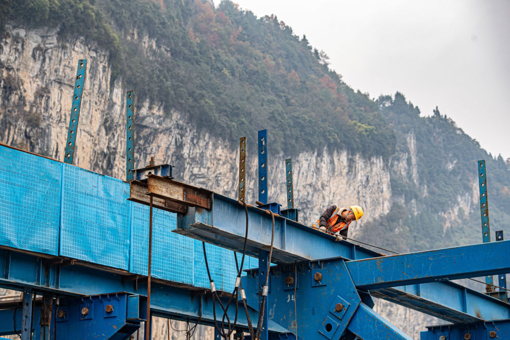 11月26日,在位于重庆市酉阳土家族自治县龚滩镇的阿蓬江大桥施工建设现场,工人正在现场作业。