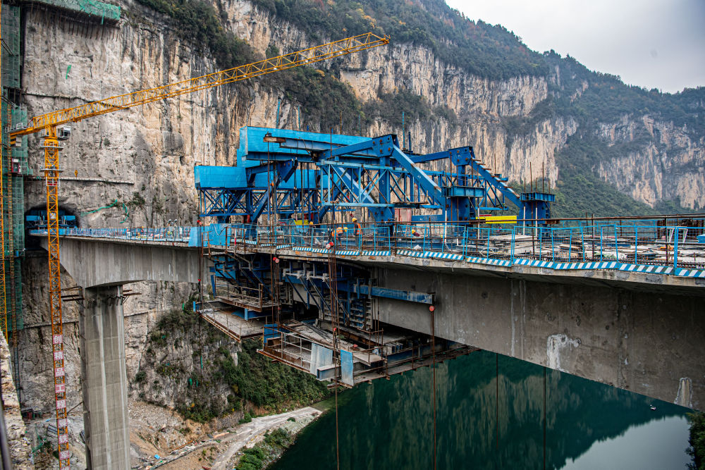 阿蓬江大桥位于武陵山区腹地的重庆市酉阳土家族自治县龚滩镇境内,大桥横跨阿蓬江,桥梁全长515米,最大墩高67米。据介绍,项目难点在于桥与崖壁相连,崖壁高度近190米,大桥临崖最大坡度近90度,桥梁部分深入崖壁形成“隧中桥”。