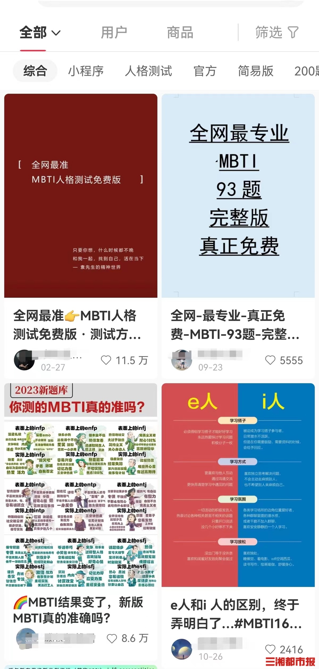 记者在一些互联网招聘平台上看到,有不少求职者吐槽“过了公司终面,却因性格测试结果和岗位要求不符被辞退”,“如何在公司面试做性格测试保证不被淘汰”的经验贴浏览量也居高不下。为此,不少商家推出了MBTI测试套餐,包含详细的MBTI测试分析及职业建议,售价几元至上百元不等,月销量上百的不在少数。在小红书平台上,一款免费的MBTI测试,点赞量就达到11万。