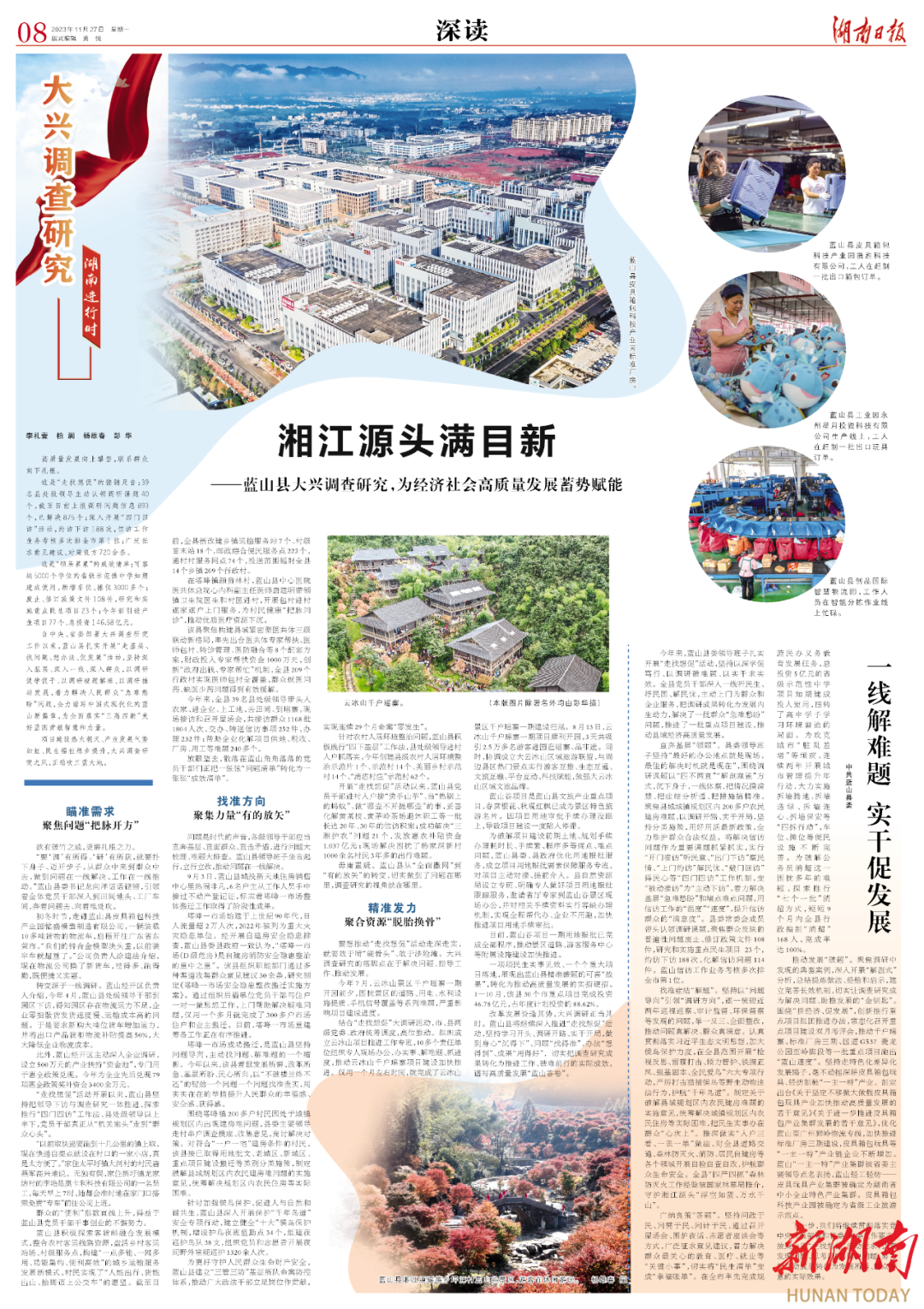 自中央、省委部署大兴调查研究工作以来,蓝山县扎实开展“走基层、找问题、想办法、促发展”活动,坚持深入基层、深入一线、深入群众,以调研促学促干、以调研破题解难、以调研推动发展,着力解决人民群众“急难愁盼”问题,全力谱写中国式现代化的蓝山新篇章,为全面落实“三高四新”美好蓝图贡献智慧和力量。