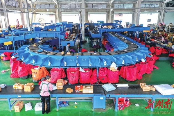 蓝山县创品国际智慧物流园,工作人员在智能分拣作业线上忙碌。