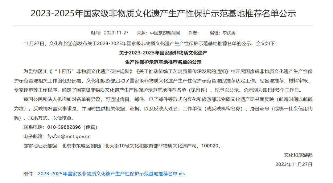 根据《“十四五”非物质文化遗产保护规划》《关于推动传统工艺高质量传承发展的通知》,文化和旅游部于2022年11月启动了国家级非物质文化遗产生产性保护示范基地的推荐认定工作,旨在促进非物质文化遗产保护,推动传统工艺实现高质量传承发展。