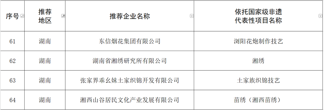 经各地推荐、材料审核、专家评审等工作程序,文化和旅游部确定并公布了国家级非物质文化遗产生产性保护示范基地推荐名单,湖南浏阳花炮制作技艺、湘绣、土家族织锦技艺、苗绣(湘西苗绣)4个项目位列其中,分别由东信烟花集团有限公司、湖南省湘绣研究所有限公司、张家界乖幺妹土家织锦开发有限公司、湘西山谷居民文化产业发展有限公司推荐。