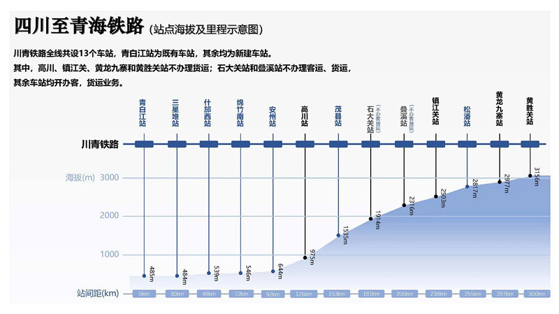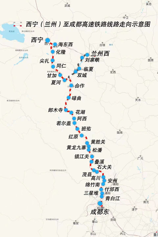 川青铁路起自成都东站,经四川省成都市、阿坝藏族羌族自治州,甘肃省甘南藏族自治州,青海省黄南藏族自治州、海东市、西宁市,接入西宁站,正线全长约836公里,设计时速200公里,为国家Ⅰ级双线铁路。全线分段建设,成都东至青白江东段、海东西至西宁段,分别与西安至成都高铁、兰新高铁共线并已投入运营;镇江关至海东西段正在建设中;此次开通的为青白江东至镇江关段。