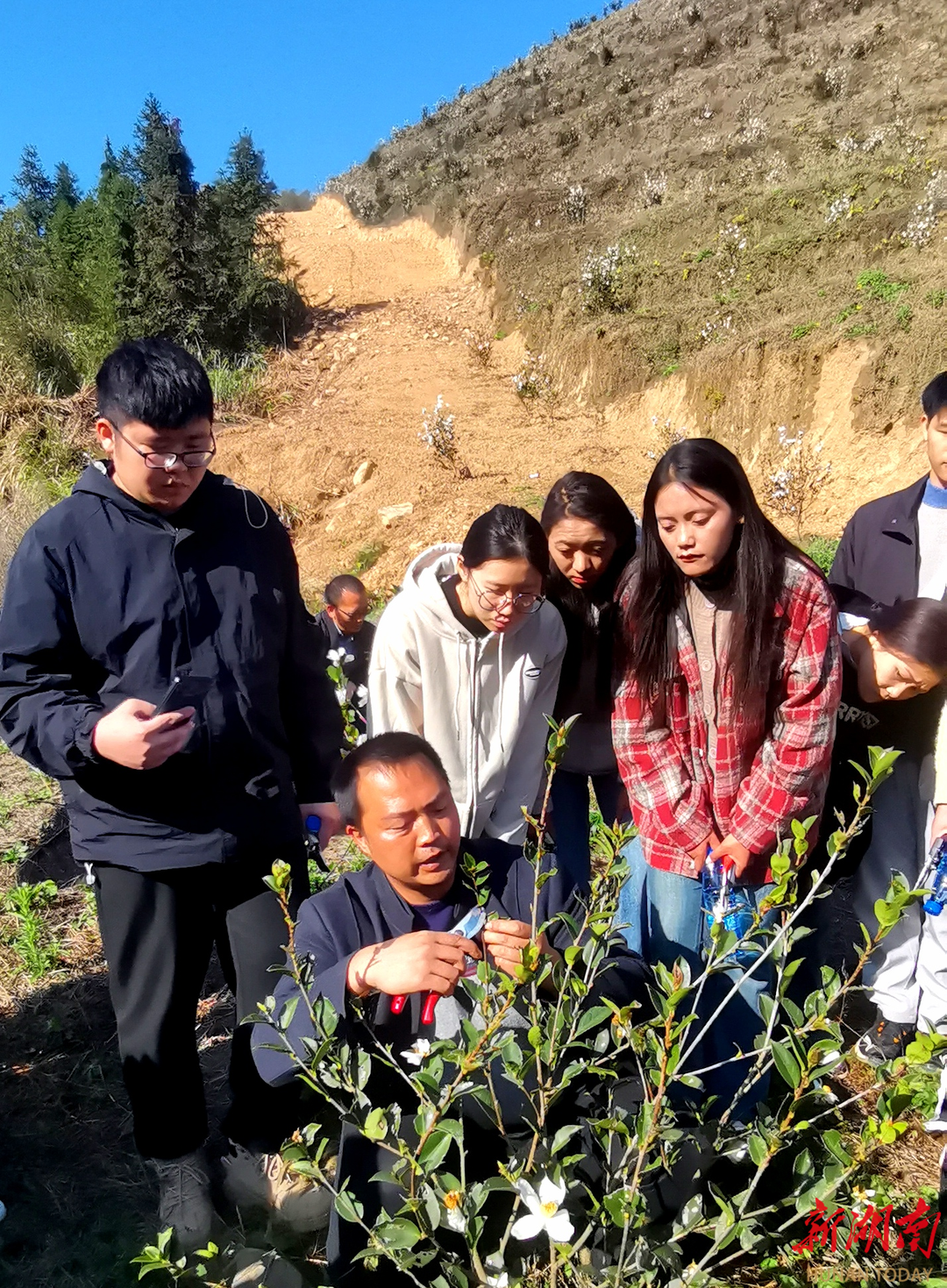 为提升科技服务质量,林业科技服务团专家针对油茶整形、疏枝、修剪等技术进行实地教学。随后, 学生们分两人一组在专家的指导下对油茶树进行修剪。