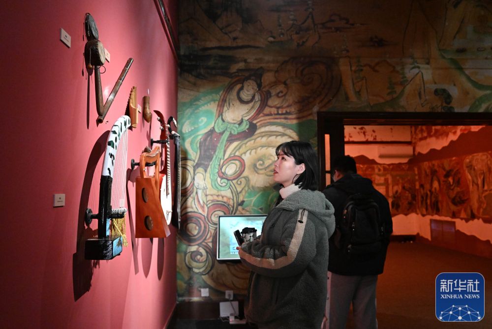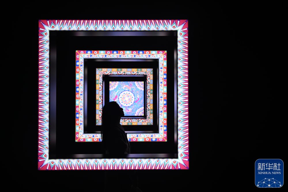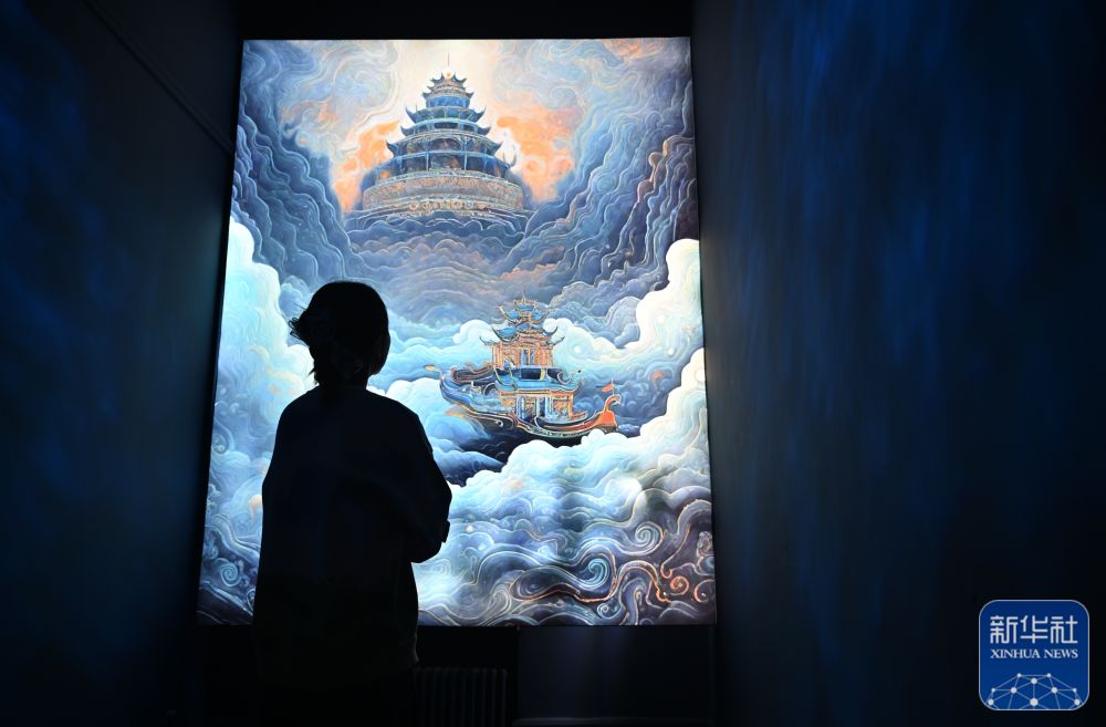 ↑11月28日,在天津数字艺术博物馆,观众在一幅艺术家重绘的敦煌壁画作品前驻足欣赏。