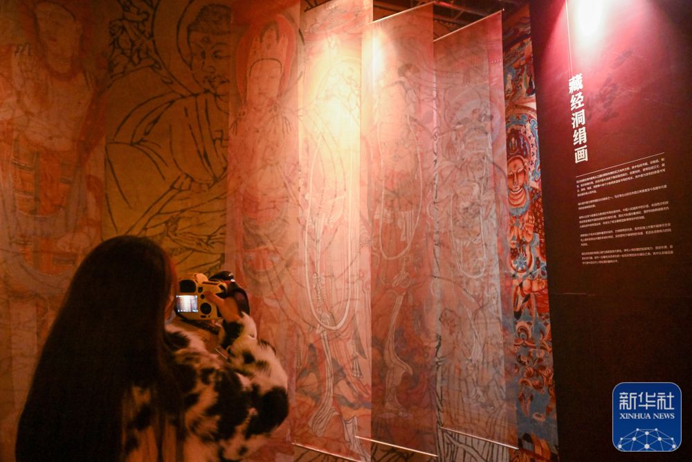 ↑11月28日,在天津数字艺术博物馆,观众参观展出的藏经洞绢画。