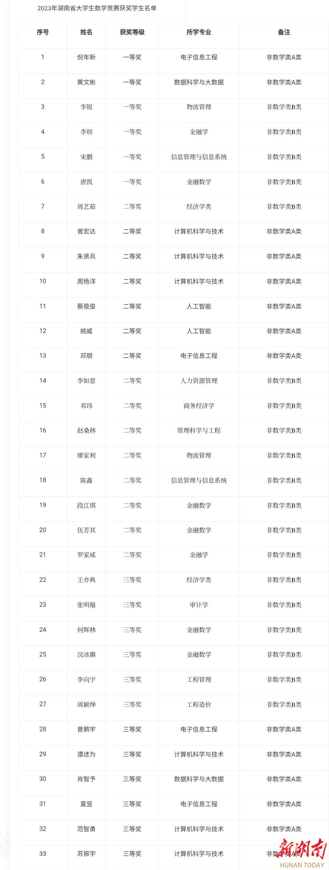11月28日,2023年湖南省大学生数学竞赛成绩揭晓,湖南财政经济学院学子获非数学专业组一等奖6项、二等奖15项、三等奖12项,非数学专业组(B类)一等奖获奖数量位列全省第二,获奖等级和奖项数量均创历史新高。