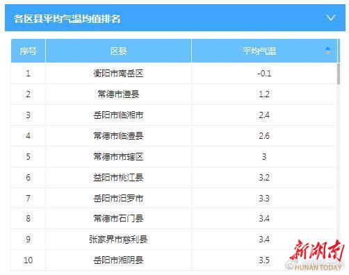 根据湖南省国家站气温实况监测显示,1日7时至8时,湘中、湘南大部气温在6~8℃之间,湘北气温偏低,大部维持在3~5℃;其中衡阳市南岳区气温跌至0℃以下,为-0.1℃,常德市澧县气温仅1.2℃。