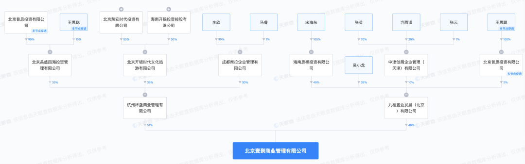 从股东情况来看,该公司有两名股东,分别为杭州杯盏商业管理有限公司和九桓置业发展(北京)有限公司,持股比例分别为51%和49%,在目前已穿透的全部股东中,共有18个股东(自然人股东8个,企业股东10个),其中就包括王思聪本人和其公司北京普思投资有限公司,并为杭州杯盏商业管理有限公司第一大股东。