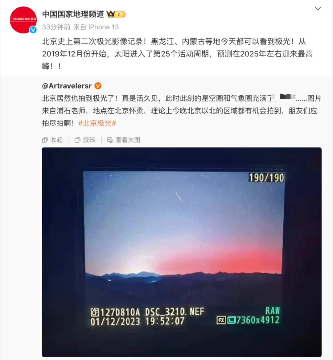 据@中国天气,由于我国地磁纬度较低,即便是较强的地磁活动发生时,也很难发生明显的极光现象,但是极光发生的高度往往在100公里甚至是300到400公里的高空,如此高的高度,足以跨过上千公里的地平线,所以当遇到合适的条件时,是有可能在我国极北地区(比如新疆、黑龙江的最北端地区)见到极光的~尤其这次北京北部也能看到,真的是非常幸运啦!