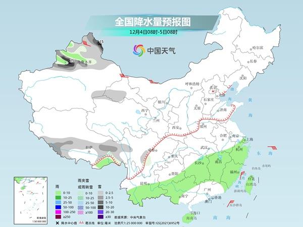 明天,新疆北疆北部等地部分地区有中到大雪或雨夹雪,高海拔地区有暴雪或大暴雪,局地特大暴雪。江南大部、西南地区东部、华南北部、海南岛、台湾岛等地部分地区有小到中雨。