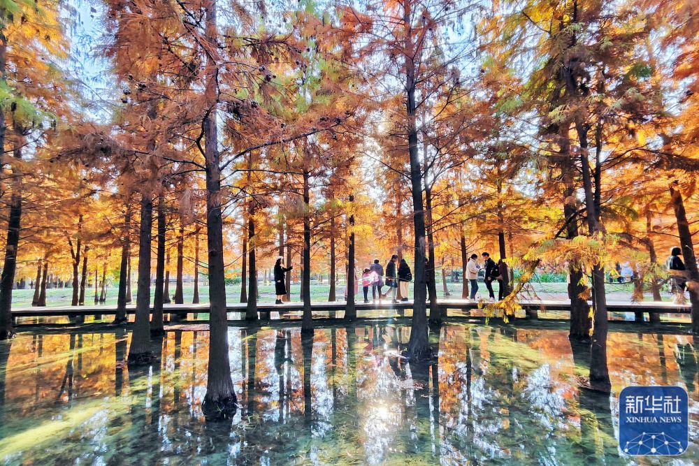 ↑12月2日,游客在江苏省常州市新龙生态林的水上森林游览。