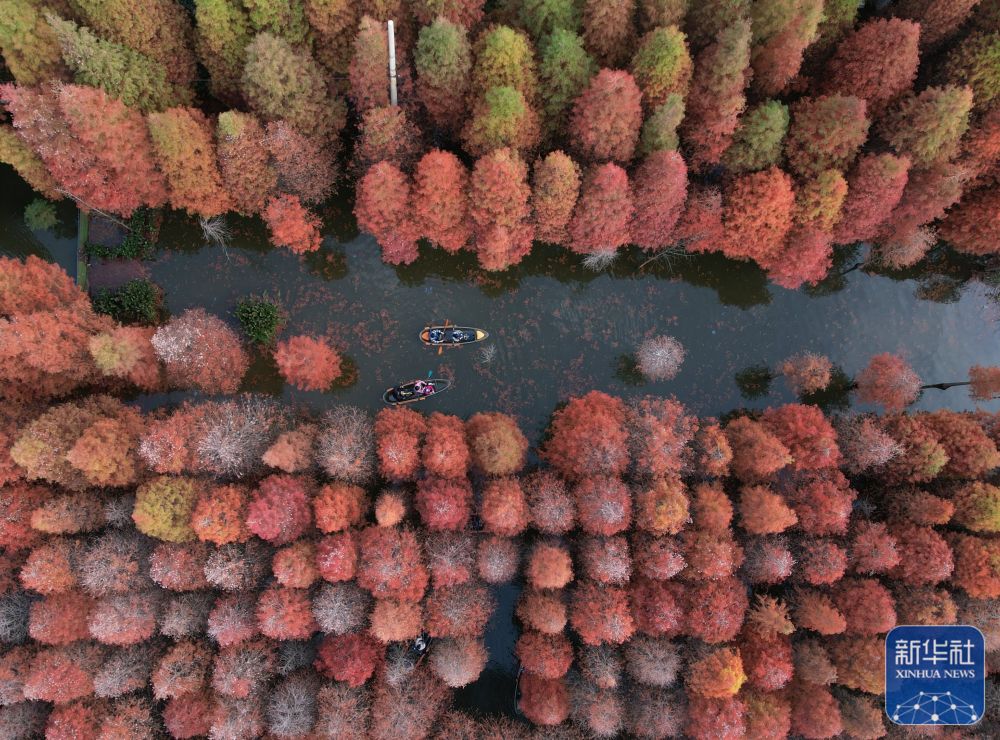 ↑12月2日,江苏省淮安市金湖县水上森林景区五彩斑斓(无人机照片)。