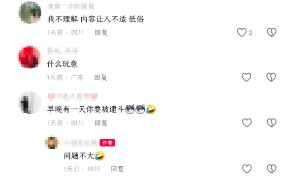 视频发布后,有网友表示不理解,“内容让人不适”,还有网友认为“早晚有一天你要被逮”,该男子回复称“问题不大”。