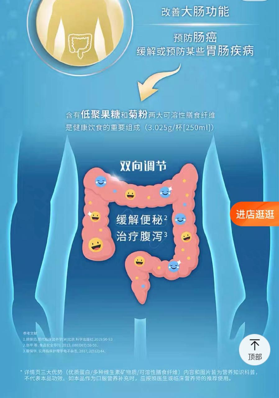 比如雀巢佳膳悠选老人营养粉,在产品外包装可以清晰看到“特殊医学用途全营养配方食品”的字样。在该产品的电商旗舰店销售页面,对该产品的所含的成分进行了一定宣传,如“乳铁蛋白富含支链氨基酸,有助于改善肌肉组织”,提到可溶性膳食纤维时,页面有“降低血浆胆固醇,减少心血管疾病”“预防糖尿病,控制肥胖”“预防肠癌,缓解或预防某些肠胃疾病”等话语。在醒目的介绍后,有一句提醒:“详情页三大优势内容和图片皆为营养知识科普,不代表本品功效”,但字号很小,容易被人忽略。